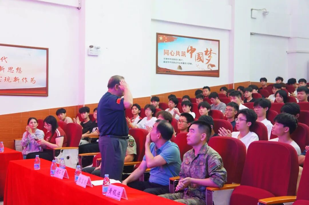 副院长张富强在大会上首先向谢石朋老英雄、人武部领导以及全体师生致以崇高的敬意和热烈的欢迎。并且强调国防教育对于青年成长和国家安全的重要意义,鼓励同学们将个人理想与国家需要紧密结合,积极投身军旅生涯,在军队大熔炉中实现人生价值。讲话中,张富强副院长特别指出,当代大学生作为国家的栋梁之才,肩负着维护国家安全与发展的重任,参军入伍既是报效祖国的崇高选择,也是磨砺自我、提升能力的宝贵机遇。