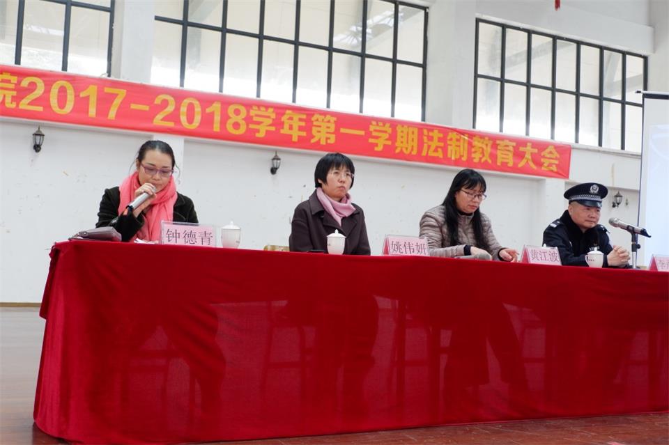 学工处钟德青副处长说道:“习总书记在十九大报告中指出,加大全民普法力度,建设社会主义法治文化,树立宪法法律至上、法律面前人人平等的法治理念。随着社会的不断发展、完善,法律教育已变得越来越重要。法律常识已成一个人成长所必须掌握的武器,我们今后要立足社会,谋求发展,法律知识必不可少。因此,开展好学法、普法已是上级的要求,也是我们贯彻上级有关指示精神的具体行动。为了让法制走进校园,进一步增强同学们的法制意识,接受法制教育,自觉遵纪守法,学会利用法律进行自我保护,做一个知法、守法的合格学生。今天,我院特举办这次法制教育活动,为全体师生做专场法制教育报告”。