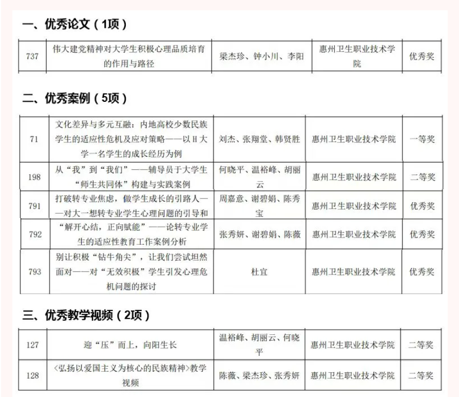 近日,高校思想政治工作队伍培训研修中心(华南师范大学)相继公布了2023年广东高校思想政治工作优秀论文、优秀案例、教学视频以及原创文化精品推选展示活动获奖名单,我校推荐报送的10件作品荣获奖项。其中,优秀论文类别优秀奖1项;优秀案例类别一等奖1项、二等奖1项、优秀奖3项;优秀教学视频类别二等奖2项;优秀原创文化精品类别优秀奖2项。获奖作品选题覆盖理论研究与学生教育管理服务全过程。